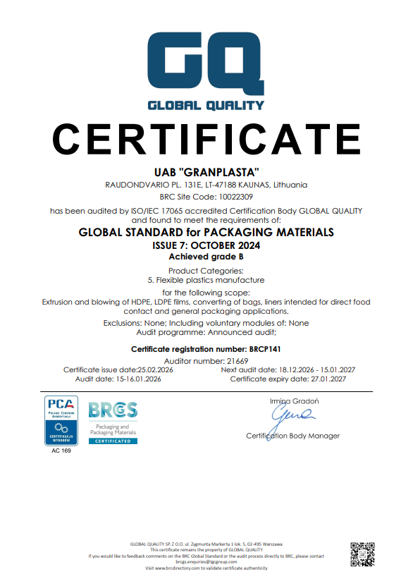 Mes, UAB „Granplasta“, suprantame, kad pakuotė yra kritinė tiekimo grandinės dalis, tiesiogiai įtakojanti galutinio produkto saugumą ir kokybę. Siekdami užtikrinti aukščiausius standartus savo partneriams, sėkmingai įgyvendinome ir sertifikavome savo procesus pagal tarptautiniu mastu pripažintą BRCGS Packaging Materials standartą.